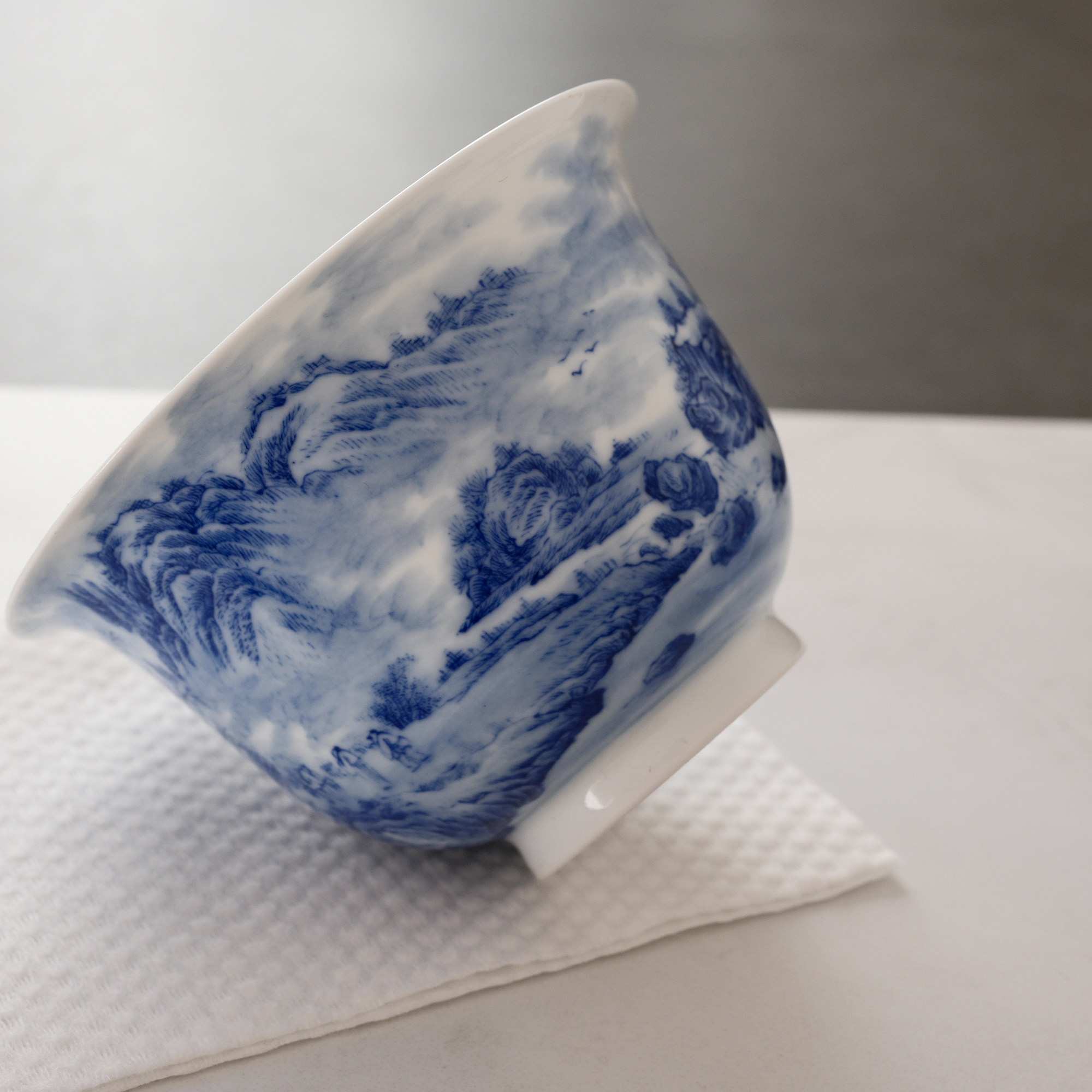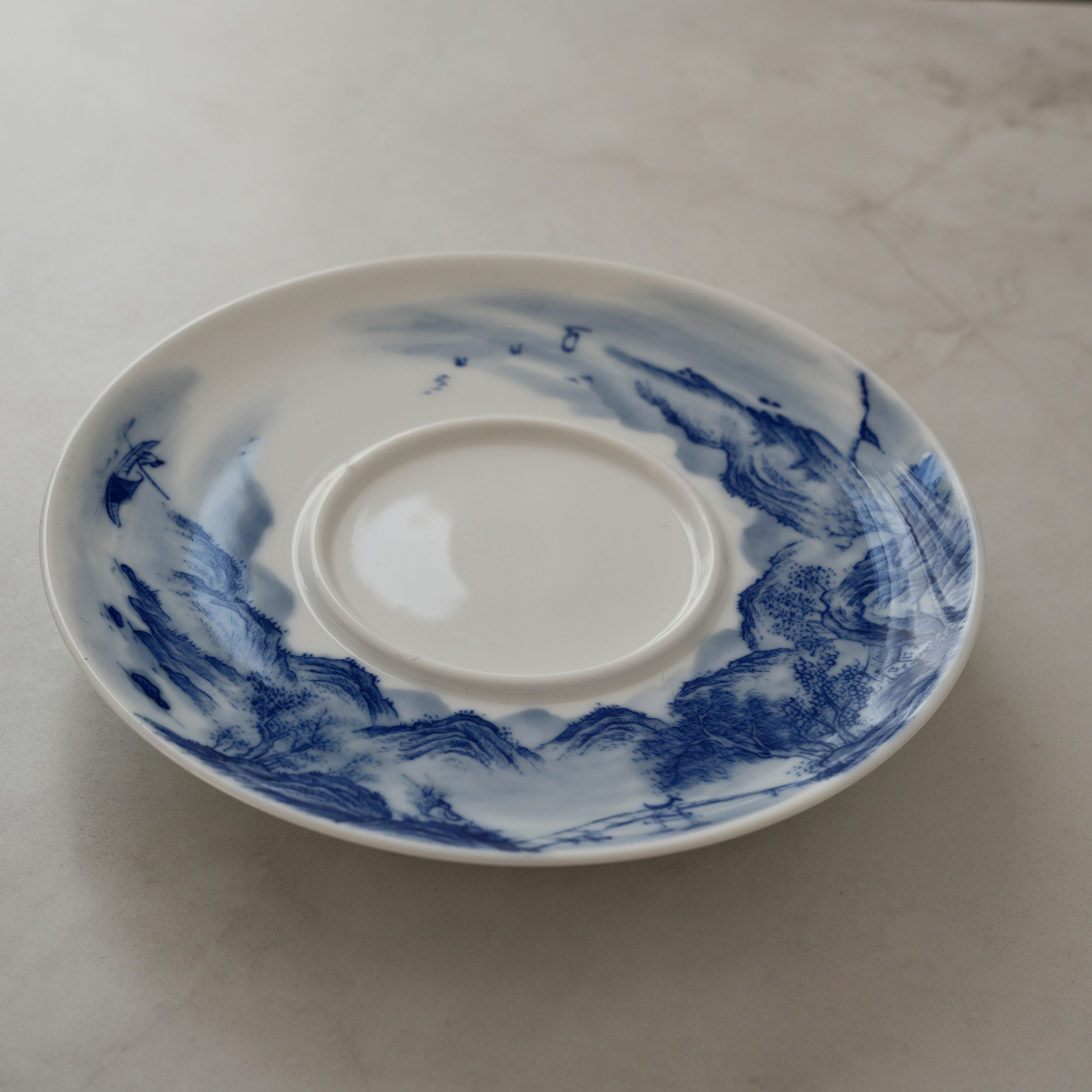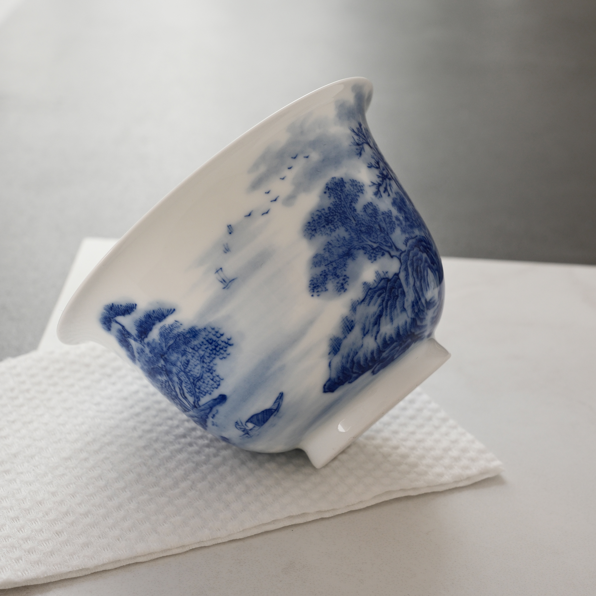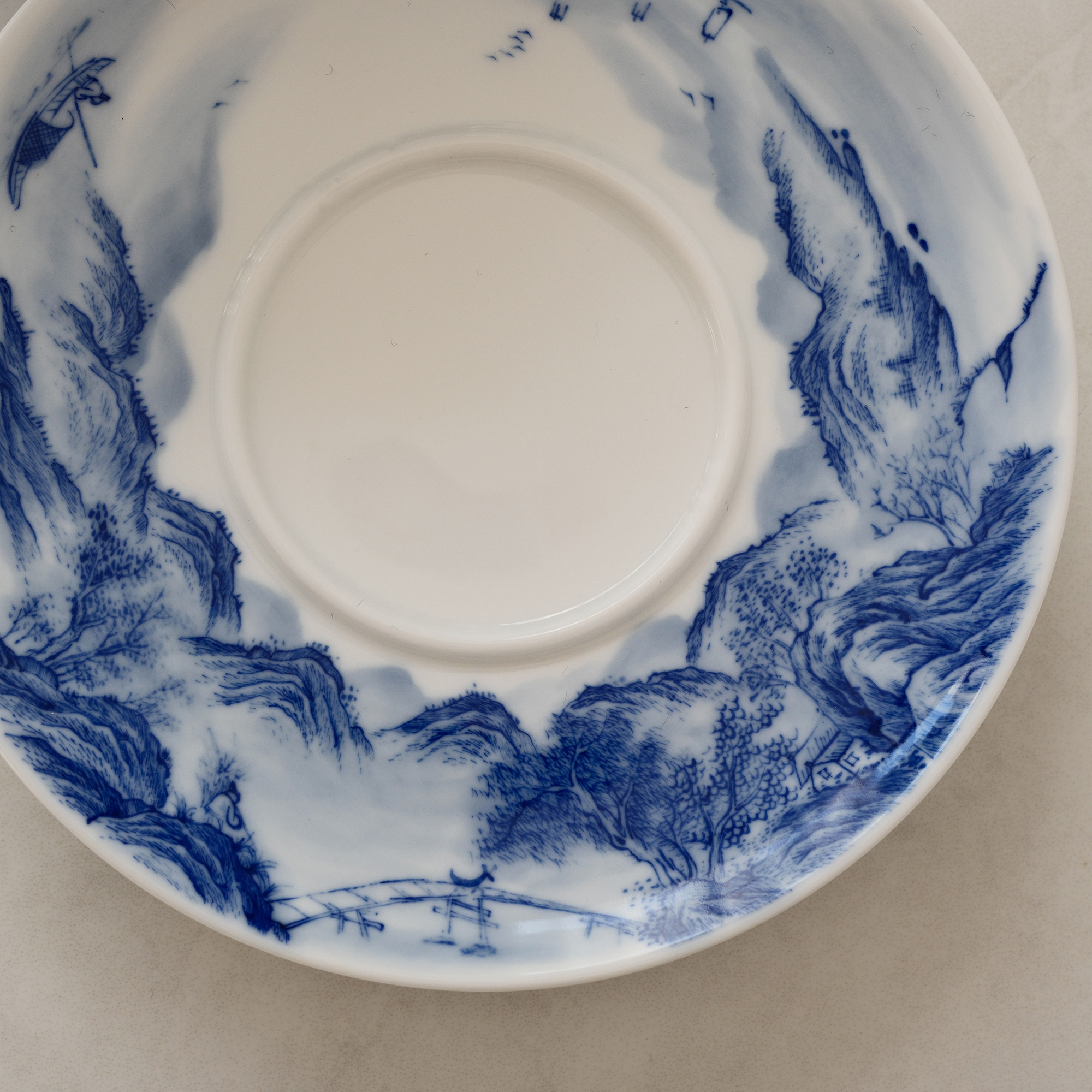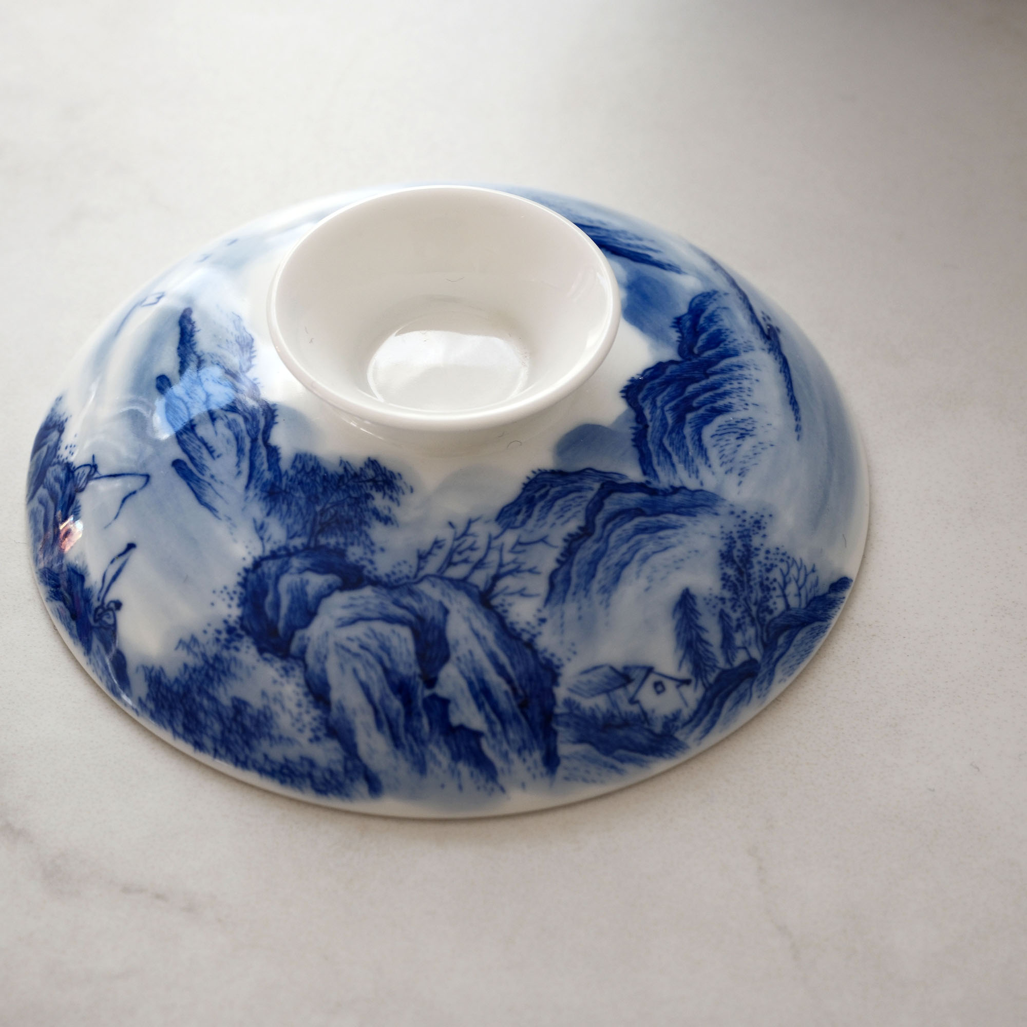 Each piece is hand-shaped, high-fired, and meticulously hand-painted with a traditional Chinese landscape scene — flowing mountains, drifting clouds, ancient pavilions, and quiet waters rendered in timeless cobalt blue on pure white porcelain.